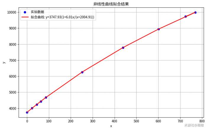 对于元素精通的提升,我们参考剧变及增幅反应的公式模型,按照【1+元素精通×A/(元素精通+B)】的模式,使用python进行拟合(拟合公式在下方折叠文档内),根据10个数据点得到如下拟合图: