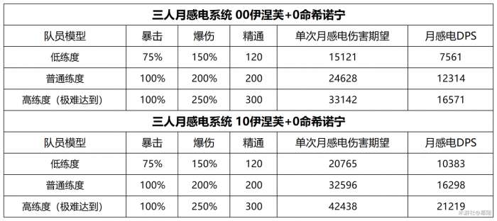 在01伊涅芙带队、队友为标准输出模型的情况下,单次【反应月感电】平均伤害在3W以下(3.7W为角色月感电),对应1.5W以下的DPS提升。作为补充,我们来看一组计算: