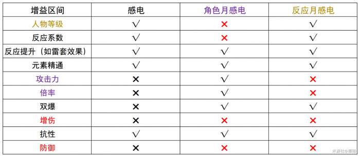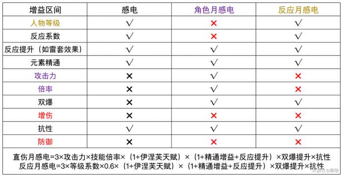相较于传统的反应模式,【月感电】这个字眼直接提供了3的基础系数(作为较低倍率的平衡),额外获得了元素精通及反应提升效果的增益,抛弃了防御区的掣肘,但相应的,失去了增伤区的加成;
