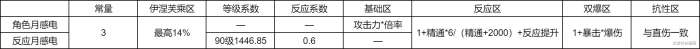 对于【角色月感电】,我们代入各项数据,发现乘区之外存在一个3的常量,如果将该常量统一化至【反应月感电】(仅起到美观效果,无实际意义),则可以认为其反应系数为1.8/3=0.6。