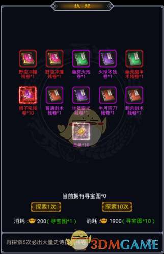 (三)技能寻宝:消耗200元宝或1个藏宝图购买1个金条后系统赠送探索机会1次,每次探索都有概率出完整技能;累计探索10次,必出史诗技能;首次累计探索10次,必出史诗技能召唤神兽;累计探索20次,必出传说技能;探索获得的技能残卷可用于激活技能或升级技能。