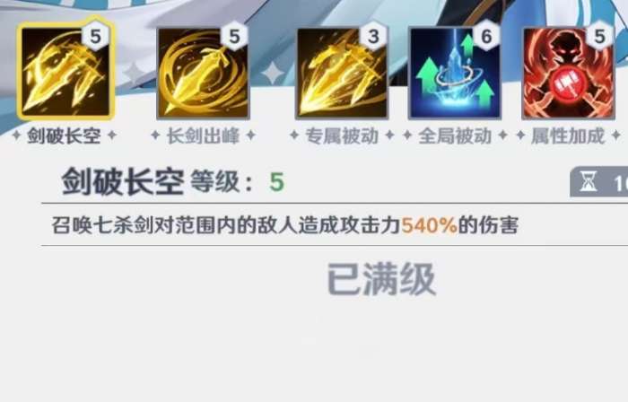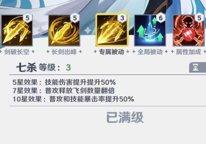 被动技能七杀,在尘心这个角色升到五星的时候,伤害可以提升50%。该技能的具体效果为释放普攻的时候,飞剑的数量可以翻倍,这不仅意味着输出的效果可以翻倍,并且暴击的概率也会翻倍哦。当达到10星的时候,这个效果会更加强大,并且几乎每个技能都是可以出暴击的。另一个被动技能叫做剑道无双,在战斗时将会削弱敌人的防御力,并且当推图的时候,尘心的存在能够使所有角色的伤害提升18%。