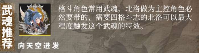 那么如果大家玩的是格斗系的角色,那么这里北洛以及赤痕都是这类劫色,就可以搭配向天空进发这个武魂,这个武魂带来的效果基本都是对斗志上面的效果,因为这两个角色都是格斗系,所以需要的蓄力基本都是靠斗志数值带来提升的,那么像天空进发这个武魂,正好可以让他们在连招当中带来最大化的爆发输出效果。