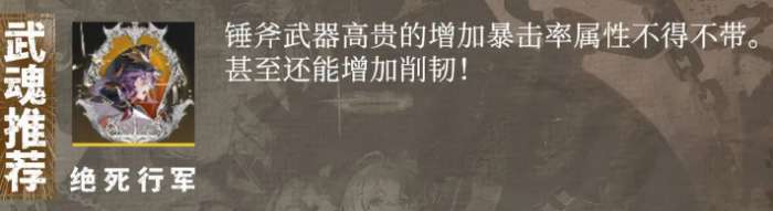 如果大家玩的是克拉拉这个角色的话,那么这里搭配的武魂建议是配合绝死行军,这个武魂的话带来的效果基本就是高额爆发,上面的加成还有一定的额外削韧,这类角色基本就是游戏当中的锤斧角色,所以搭配上绝死行军的话,让角色在输出和控制上面都有足够的提升能力。