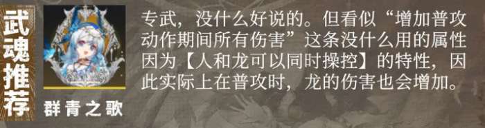 如果大家玩的是伊莱莎这个角色的话,建议搭配的武魂是群青之歌,虽然这个武魂表面上的效果只是带来普攻上面的提升效果,但是因为很多的角色目前玩普攻的话,连招的次数很多,所以这个武魂基本是可以带上的,这上面的加成看起来输出效果上面也会有一定的提升效果,跟伊莱莎这类角色搭配在一起绝对是不违和的,这一加成实际上作用在伊莱沙不同状态的情况下,它带来的普攻整体输出也会有足够的提升效果。