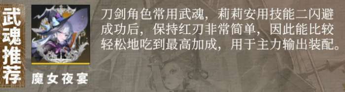武魂在需要搭配的情况下,大家可以把它看成专属的武器系统,从这里不仅可以为不同的角色带来定位上面的加成效果,还可以让角色技能带来足够的强化能力,那么在目前选择武魂的时候,大家一定要考虑到的就是这些武魂跟角色定位上面的契合度怎么样,比如说输出类型的角色,一定要考虑到伤害提升效果的武魂或者是暴击技能倍率,能够提升此类效果的武魂会更适合他们,如果大家玩儿的是刀剑系角色的话,比如说莉莉安,她适合搭配的武魂就是魔女夜宴,有了这类武魂,她在技能2使用的情况下,能够带来足够的闪避成功概率,而且可以保持住更高输出的红人状态,此时还可以稳定触发到最高的加成数值。