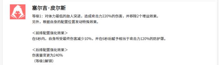 米里昂的第二个技能叫做塞尔吉皮尔斯,使用这个技能攻击的时候,她会选择一个体力最低的敌人,达到输出动作之后造成的伤害达到220%,此时还可以移除掉敌人身上两个增益能力,另外根据他自身的位置,发动这个技能的时候,如果是在前排,那么在6秒时间之内,米里昂会受到最终伤害减少10%的影响,但是在施加成功之后,他会根据这个能力附加自己攻击力上面120%的防御护盾,如果是米里昂站在后排的话,根据这里的强化效果就会让自己的伤害量提升到20%,所以根据站位来确定这里米里昂的提升能力,还是比较具有灵活性的。