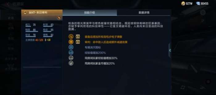 AK47-末日审判的技能在整个AK家族也属于独一份,常规性配置了“装备后增加所有背包步枪子弹数“的属性,独特性配置了”审判:命中敌人后造成额外减速效果”的属性,这个属性在当前枪战游戏中堪称独一档的战略级配置,能打乱对手的节奏,创造出其不意的战术机会,无论是追击、撤退还是团队配合,都能带来巨大的优势,大家可以上手去体验。
