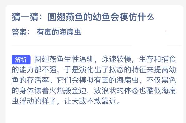 以上就是猜一猜:圆翅燕鱼的幼鱼会模仿什么?神奇海洋今天答案最新2025年11月30日分享,更多相关攻略内容,请点击关注pk游戏网更新!