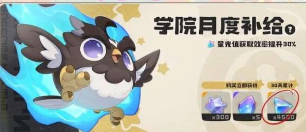 先来看一下月卡,这里就会有30元的学院月度补给,所以这绝对是一个性价比之王,买了之后一点都不会亏。在入手之后还可以拿到300洛克钻石,还有5个体力钻石。这两个在初期开荒时都是硬通货,可以通过钻石去更换道具,还可以更好的去刷副本。接下来30天每天签到,累计就可以领取4500个水晶,而且还可以解锁星光数值可以得到30%的加成。