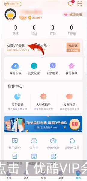 1、首先打开【优酷视频】,然后点击右下角【我的】图标,接着点击【优酷VIP会员】,