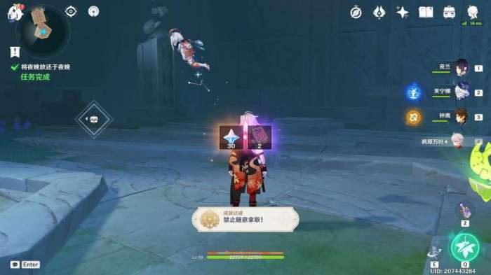 对话结束,完成任务「将夜晚放还于夜晚」,获得成就「禁止随意拿取!」,获得珍贵的宝箱