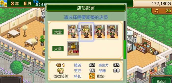 员工的管理是创意咖啡店物语中不可忽视的一部分。玩家需要根据店铺的运营情况,合理雇佣服务员、厨师和清洁工等角色。员工的技能水平会影响工作效率和服务质量,因此玩家需要根据自身资金情况选择合适的员工,并合理安排他们的工作时间,避免出现人手不足或过度劳累的情况。