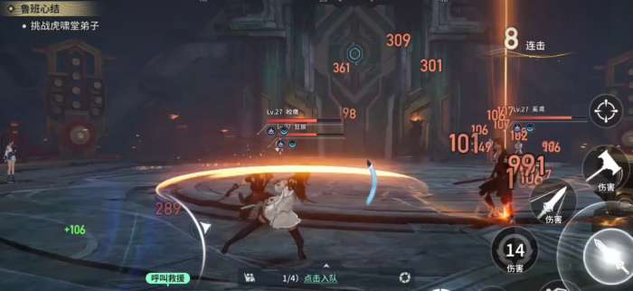 上去之后,就会碰到虎啸堂弟子,这里是真正的挑战。如果打不过,可以喊好友一起来。没有固定队友也没关系,界面上有个呼叫功能,可以招陌生玩家帮忙。