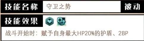 主动加防与被动加防、回血,和开局赋予自身HP护盾的性能,让他的技能组其实是适合当主T的,然而他目前只能靠必杀赋予仅2回合的挑