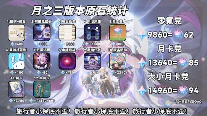 在没有新地图等福利的加持下,6.2版本原石奖励也是大幅缩水,平民玩家零氪才62抽,不到1万原石,小月卡玩家可以达到85抽,大小月卡玩家是94抽,相当于14960原石,还是比较少的。
