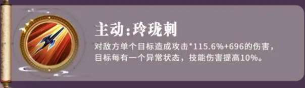她的另外一个主动技能叫做玲珑刺,玲珑刺这个技能是一个单体目标的技能,使用的时候会对一名敌人造成攻击,这里的输出数值达到了115%的攻击数值,然后再加上固定的696点伤害,此时他会根据敌人身上的状态带来一个叠加伤害,如果选择的这个对象,他身上有一个异常状态的话,技能伤害就可以提高10%,而且这个效果还是可以进行叠加的,当然最后叠加的数值也不能超过张春华攻击力的两倍。