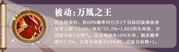 张春华的第三个技能是一个被动技能,叫做万凰之王,使用这个技能的时候,一般是在回合结束的时候可以触发,其中有60%的概率会对其中的一个敌人进行释放输出,这里的输出是根据他生命上限的13%,加上攻击的33%,再加上固定的1003的生命值进行输出,并且在此时她还会给队友恢复一点怒气数值,自身每损失10%生命的时候,他的触发概率就会有所提升,一次提升就达到了7.5%,而在她生命数值低于65%的情况下,他这里的恢复目标数值会加1个,也就是说此时会给两个队友都带来足够的恢复量。