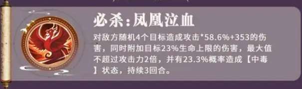 所以如果大家要用张春华的这些特征,负面效果是大家一定要注意到的,张春华她的技能当中第一个必杀技叫做凤凰泣血,这个技能可以对敌方的4个敌人造成一定的攻击,这里选择敌人的时候是进行随机选择的,但是4名敌人的进攻并不代表整体的输出数据就比较差,这里的数值是根据她本身的攻击百分比加上固定的伤害数值,这里攻击百分比会提取58%左右的数值,再加上固定的353点伤害,一起造成一个合计的伤害,同时她还会给这四个目标再加上32%生命上限的伤害,所以在连击的上限伤害上面还是比较大的,当然这里的最大值一般来说都是不超过张春华总体攻击的两倍数值,但是会有一个比较小的概率可以让对方进入中毒的状态,概率触发是23%左右的数值,所以如果她走控制流的话,这个中毒的效果是一定用得上的。