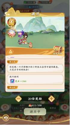 道友可以通过游历快速消耗体力获取修为和其他奖励哦~前期获取的资源建议优先用于提升境界。