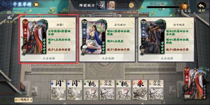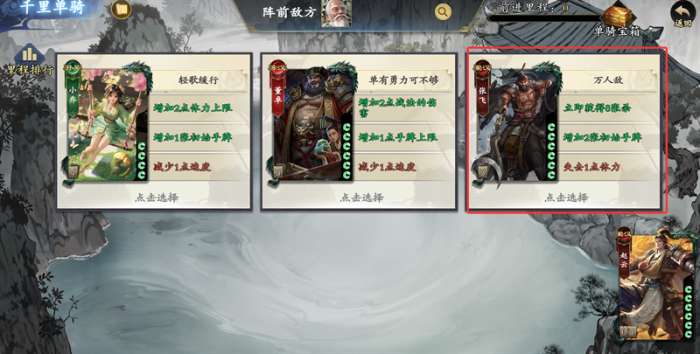 优先选择提升杀伤害的增益,此外生命、速度、立即获得8张杀等效果也可优先选择。如果有武将投奔选项,也可优先选择,虽说是“千里单骑”,但一打多到后期压力较大(赵云需要堆速度,否则后期速度不足,会被抢刀)。