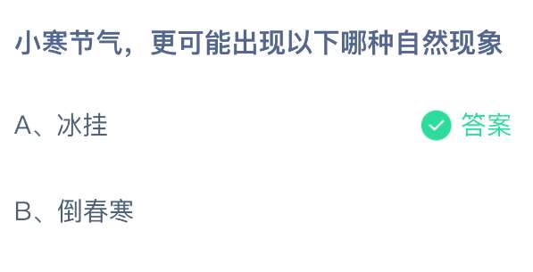 小寒节气,更可能出现以下哪种自然现象?支付宝小鸡课堂开课啦!每天花一分钟答题赚饲料,喂喂小鸡就能贡献爱心啦!轻松又意义十足!2026年1月5日蚂蚁庄园的小鸡课堂题目正确答案是【冰挂】,小寒节气,冰挂是更可能出现的自然现象。