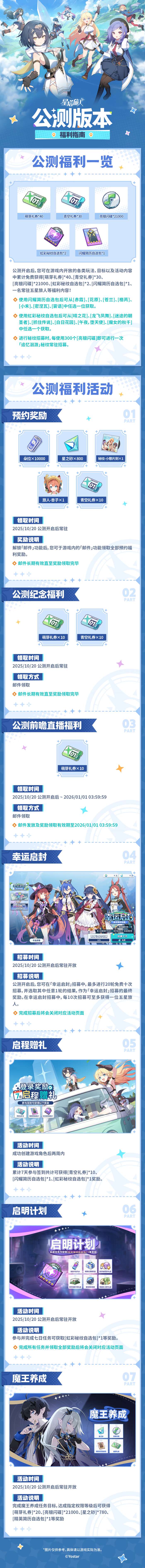公测开启后,魔王大人可通过体验游戏获得[萌芽礼券]*40、[青空礼券]*30、[亮银闪碟]*21000、[虹彩秘纹自选包]*2、[闪耀简历自选包]*1、一名常驻五星旅人等福利内容!查看长图可了解福利内容详情~