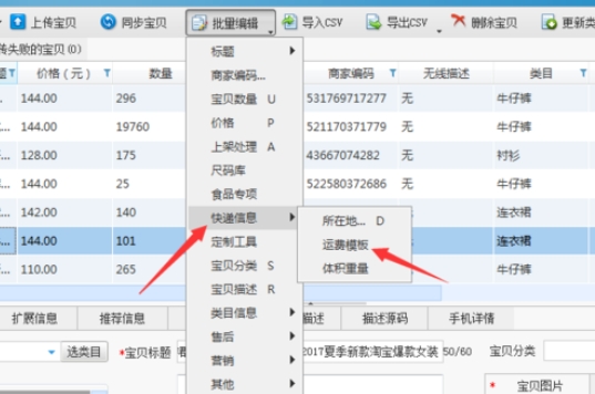 8、完成图片搬家后,就可以添加运费模板了,点击批量编辑-快递信息-运费模板即可,然后选择你设置的一个模板即可,点击保存;
