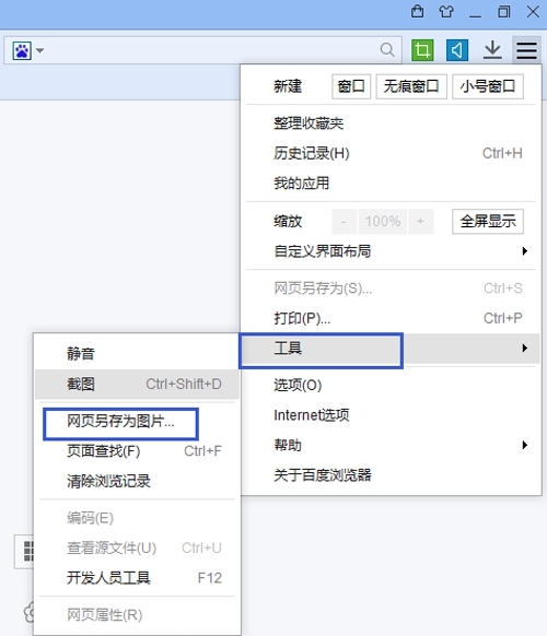 4、截图整个完整网页为图片,进入百度浏览器【工具】,选择【网页另存为图片】就可以了。