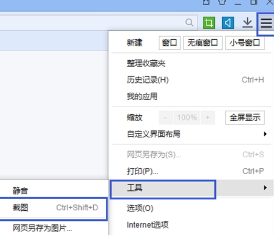 2、你也可以在百度浏览器菜单中的工具中找到【截图】功能;