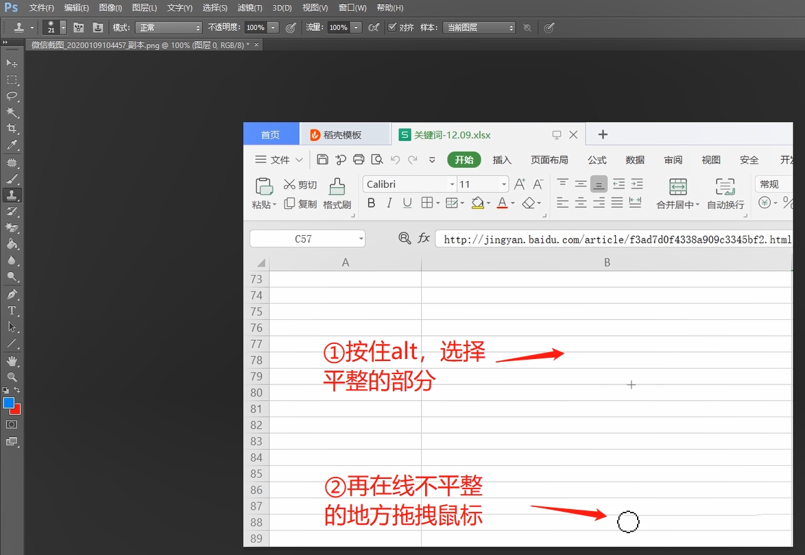 5、按住alt,点击正常线的部分,再到不平整的部分,点击鼠标左键并拖拽,这样线就能回到平整的状态了。