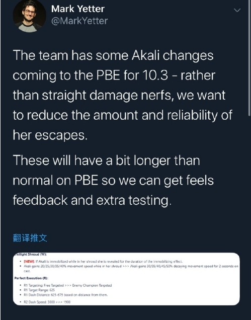据英雄联盟设计师Mark Yetter在推特上透露,这次更改阿卡丽是希望减少其逃脱的次数与可靠性,而不是直接削弱她的伤害。