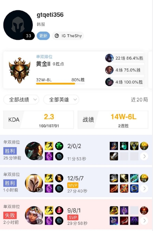 终于摆脱青铜段位,TheShy以40场80%胜率晋级黄金二,光速上分。重点是有好几场都是凌晨四五点在排位,不得不说职业选手为了上分是真的拼啊。