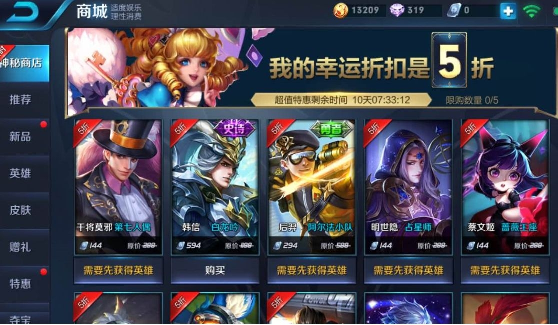 除了皮肤还可以换英雄,英雄首选依然是嬴政,毕竟唯一获取方式只有点券,那就肯定要打折买划算,剩下的看情况,能买皮肤尽量买皮肤,毕竟一次活动最多买5个。