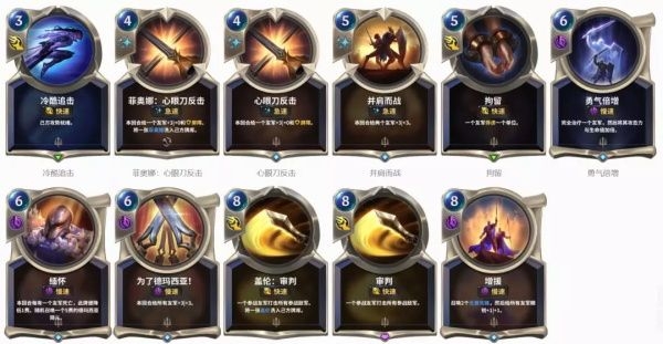 我们还是拿德玛西亚的法术牌来举例,可以看到每一张法术牌都有不同的效果。每张法术牌根据自身的属性展开行动,也就是我们说的急速、快速和慢速。