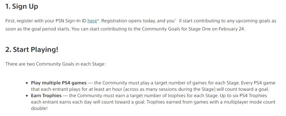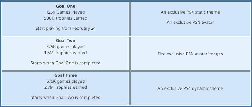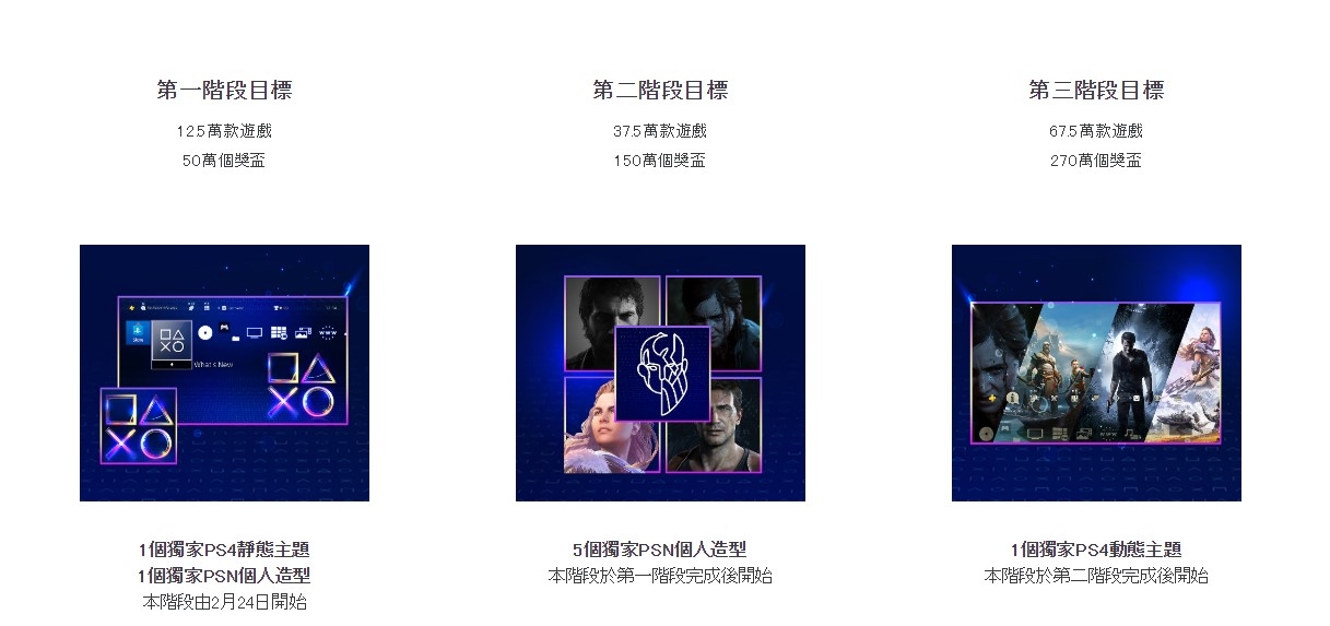 活动规则:本次的 PlayStation 玩家庆典活动,仍需要各位玩家们的共同努力才能达成各个目标。活动的每个阶段都有指定的游戏数量及奖杯数量,玩家们需要在游戏中至少游玩一个小时才能加入统计,每人每天最多只能计入6座奖杯(多人游戏奖杯按双倍计入)。