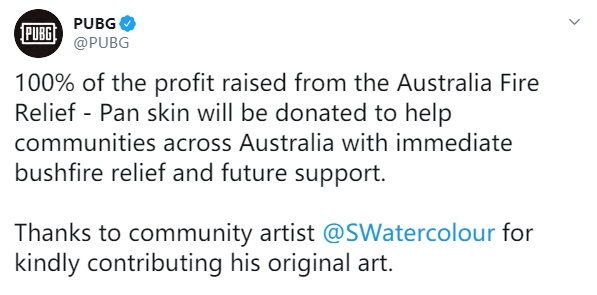 澳洲大火想必大家都有所听闻了,这件事情被公告之后,各种捐款纷纷而至。2月20日)《绝地求生》官方推出了一款印有“袋鼠和考拉”的平底锅皮肤,这次皮肤收入官方决定投入到救助捐款中。