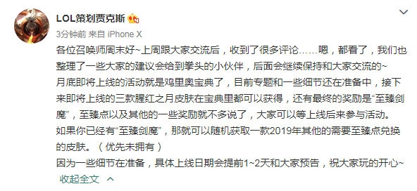 昨日,LOL策划贾克斯在微博透露了一波即将上线的活动,在听取了LOL玩家的建议后,月末将上线鸡里奥宝典活动,目前专题和一些细节还在准备中。