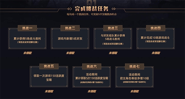 2月24日起至4月22日,铁甲大陆上的每一位玩家都将收到七个不同难度的挑战任务,其中包括累计胜场数、新增好友、领取活跃宝箱等不同类型挑战。挑战任务自动接取,并且任务没有时间限制,但是需要注意的是,每天最多只能完成一个挑战任务,并且任务只能按照顺序完成!
