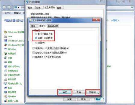 7、将语言栏的状态改为“悬浮于桌面上”或者“停靠于任务栏”,然后点击右下方的“应用”和“确定”按钮,这样就可以看到输入法的图标了。如图所示: