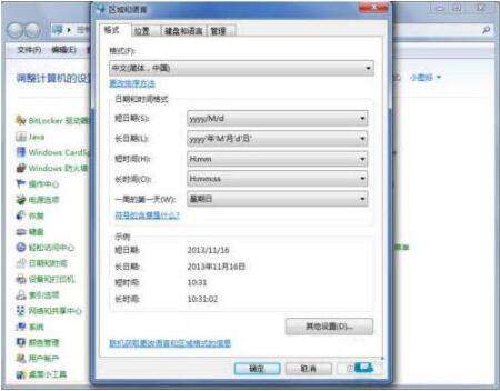 3、点击“区域和语言”后,就打开“区域和语言”设置对话框,默认位于格式选项中。如图所示: