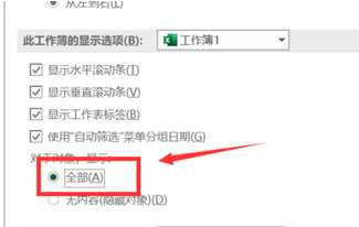 4、然后我们在右边找到“此工作簿的显示选项”,可以看见下方有“对于对象,显示”,这里我们勾选“全部”,然后点击确定就好咯,回到表格就可以看见按钮恢复了哦。