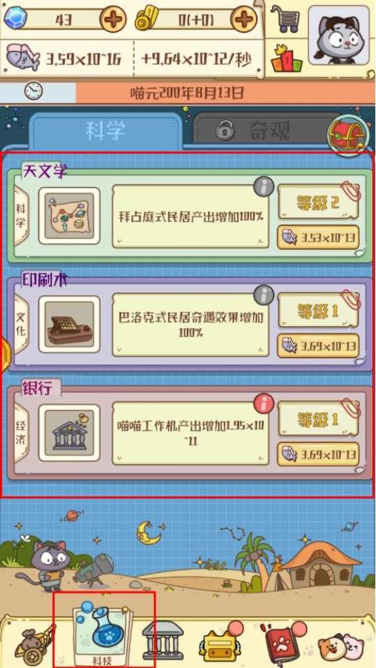 通过升级发展科技页面的“科学”支线,也可以增加对应建筑阶段的小鱼干产出百分比。