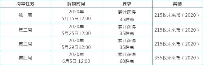 所有周常胜场任务结束时间均为2020年6月17日6:59。周常胜场任务按顺序解锁,活动期间无论何时购买门票,都将首先获得第一周周常胜场任务。