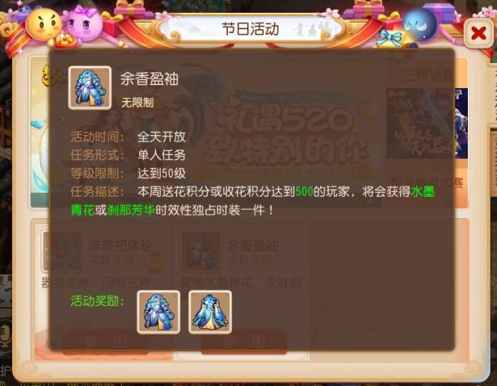 另外,在5月18日~5月24日期间,送花积分或收花积分达到500的玩家,将能获得水墨青花(女)或刹那芳华(男)时效性独占时装一件。想要身着同系列时装表达彼此感情的朋友切勿错过!