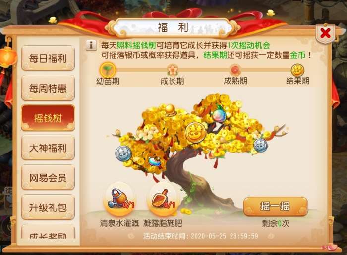 除了以上游戏活动外,等级≥50级的玩家,每天可以通过累积活跃度获取清泉水和凝脂露用来照料摇钱树。完成照料后即可获得一次摇动摇钱树的机会,每次摇动可以掉落大量银币,运气好的玩家还可以额外获得彩果等丰厚道具奖励。