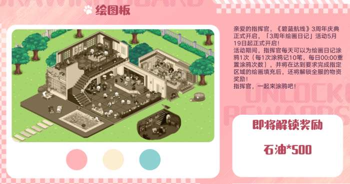 活动期间,指挥官每天可以为绘画日记涂鸦1次( 每1次涂鸦记10笔,每日00:00重置涂鸦次数),并将在达到要求完成指定区域的绘画填充后,还将解锁全服的物资奖励!