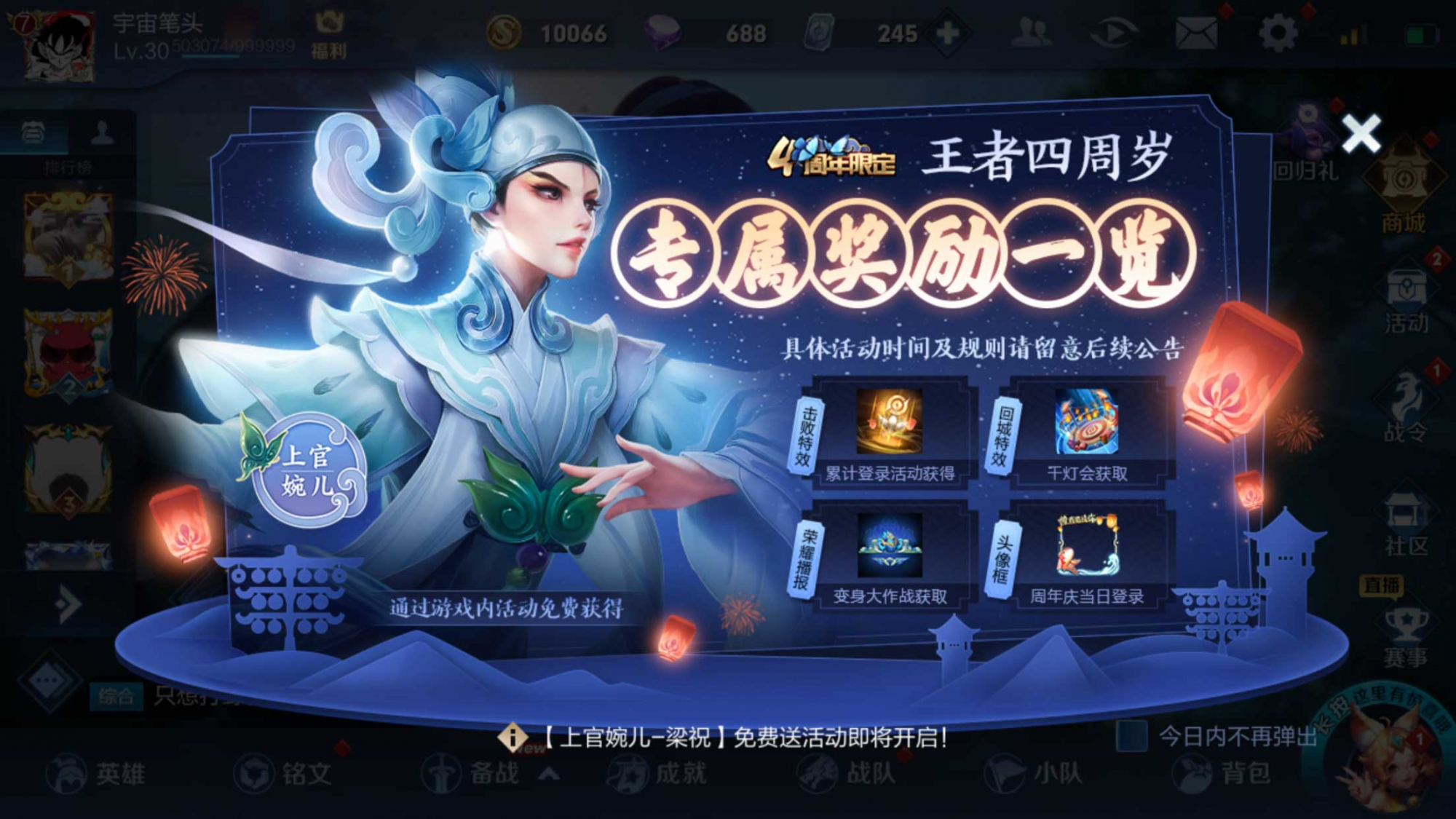 值得一提的是,正值王者荣耀四周年庆典,本次上官婉儿越剧皮肤可以在游戏内免费获取,在游戏中听一场免费的越剧,一定不要错过!