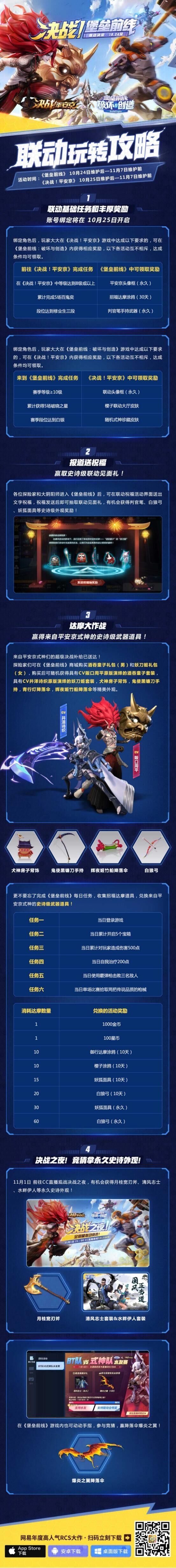 随着大江山之主的到来,《堡垒前线》也联合《决战!平安京》为广大探险家和大阴阳师送上丰厚好礼。探险家只要在《决战!平安京》中绑定角色,并达成简单的任务,即可获得包括平安京头像框、招福达摩涂鸦、判官笔手持武器等SSR超级决战补给。而若是在《堡垒前线》中达成相关要求,同样也能在《决战!平安京》中解锁永久联动头像框、樱子联动大厅皮肤、随机式神珍藏皮肤等好礼。