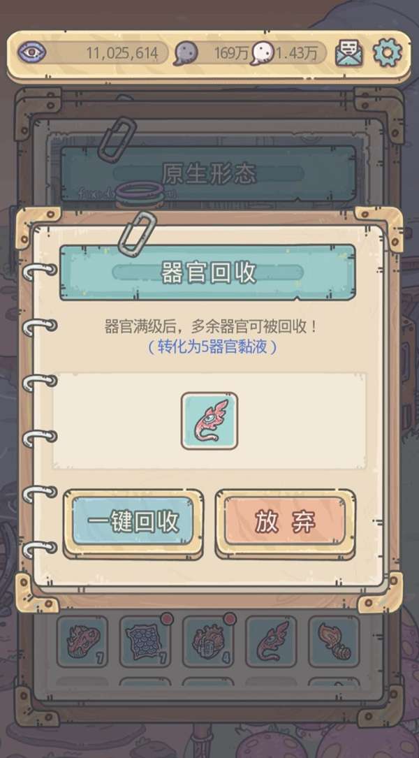 器官满级后可以进行回收从而获得材料黏液